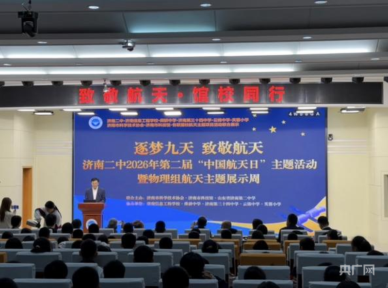 央广网济南4月23日消息(记者程立龙 实习记者张雨萱)恰逢中国航天事业创建70周年,在2026年中国航天日“七秩问天路,携手探九霄”的主题指引下,4月22日,山东省济南第二中学携手济南市科学技术协会、济南市科技馆联合主办的第二届“逐梦九天,致敬航天”中国航天日主题活动举行。来自省市航天领域专家、五所联盟校师生代表与济南二中全体师生齐聚校园,共同开启一场集科普讲解、实践体验、成果展示于一体的航天盛宴,让航天精神在青少年心中落地生根。