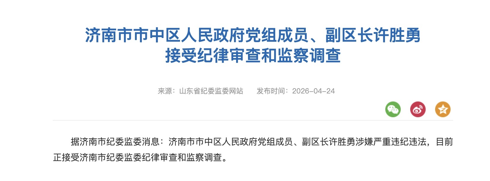 央广网济南4月24日消息(记者程立龙)山东省纪委监委网站4月24日消息,济南市市中区人民政府党组成员、副区长许胜勇涉嫌严重违纪违法,目前正接受济南市纪委监委纪律审查和监察调查。
