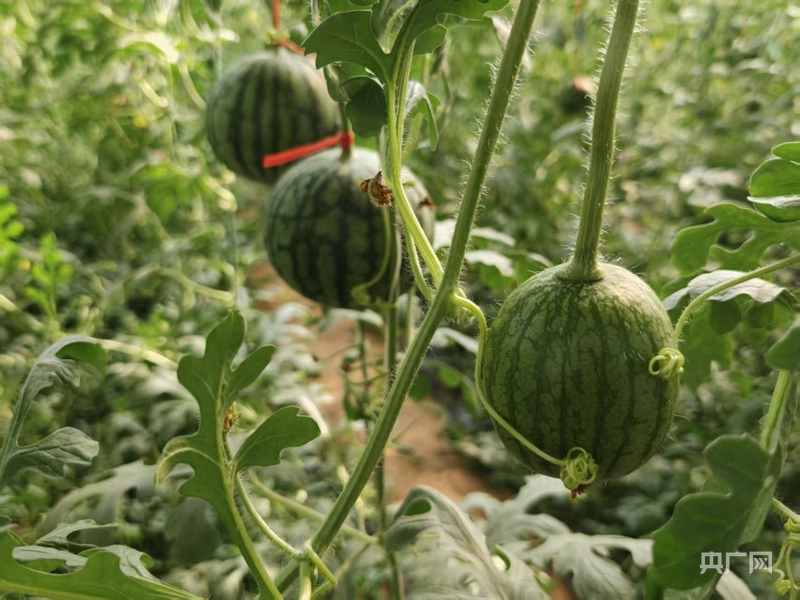 富硒西瓜生产大棚内,吊秧栽培的仁风西瓜长势喜人(央广网发 任茹伊 摄)