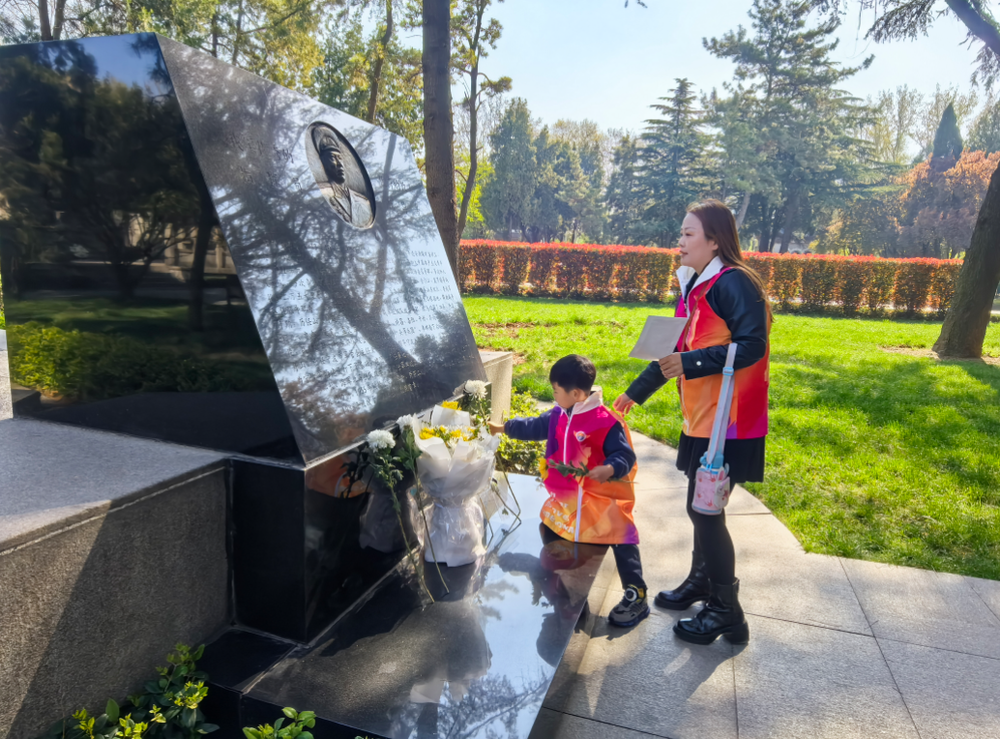 4月2日上午,参加“赓续红色血脉 缅怀英烈伟绩”清明节红色文化沉浸式研学活动的百余名小学生,手捧黄白菊花,依次来到纪念碑前。他们弯腰将鲜花轻轻放下,有的孩子还蹲下身来,轻轻擦拭碑面浮尘。