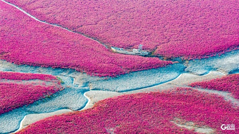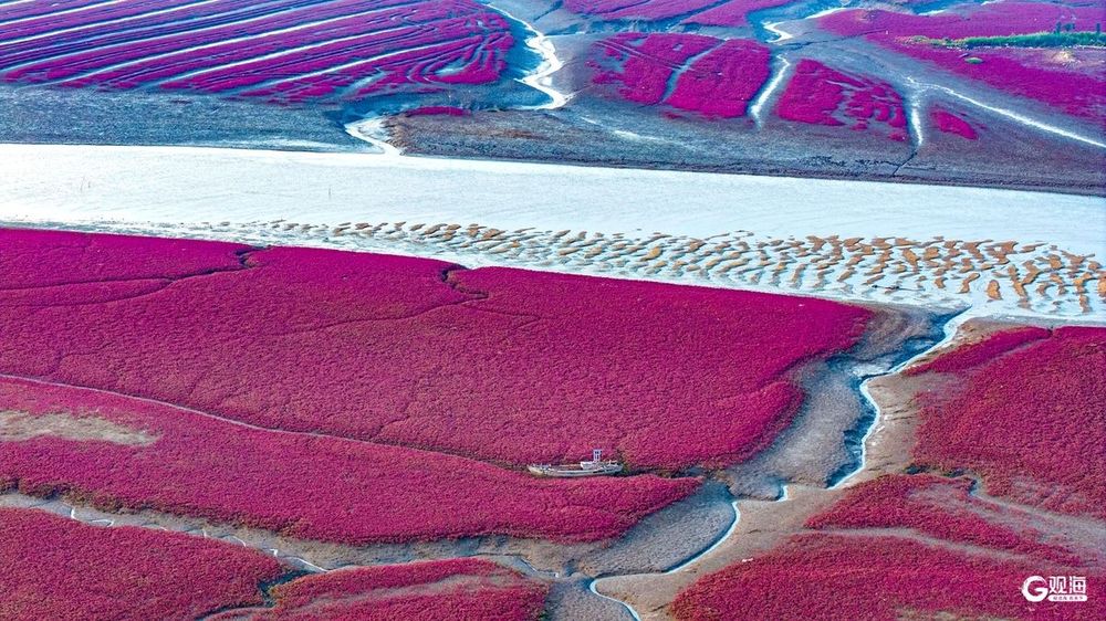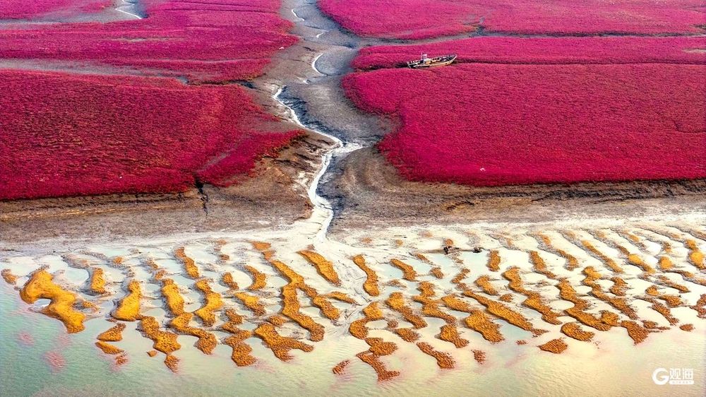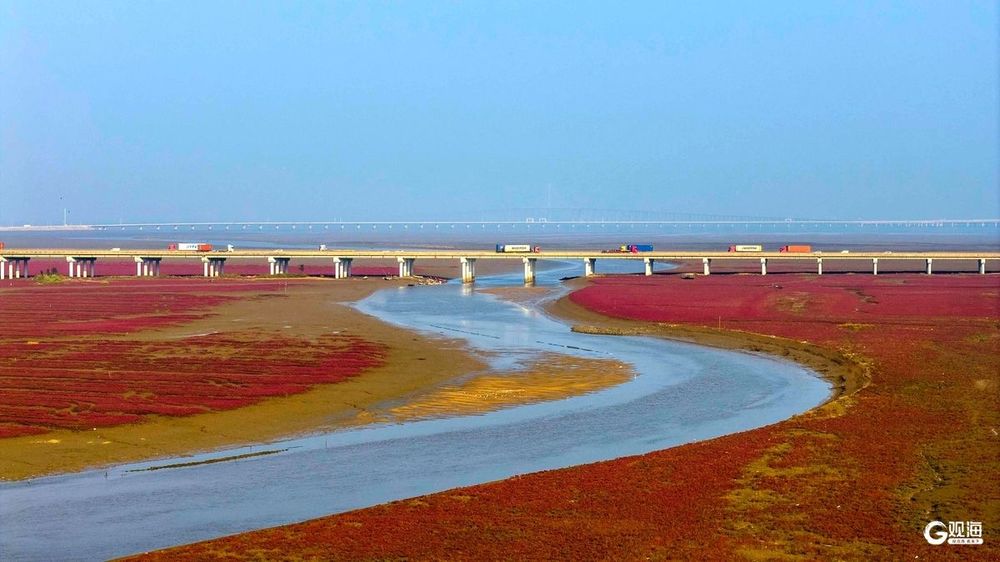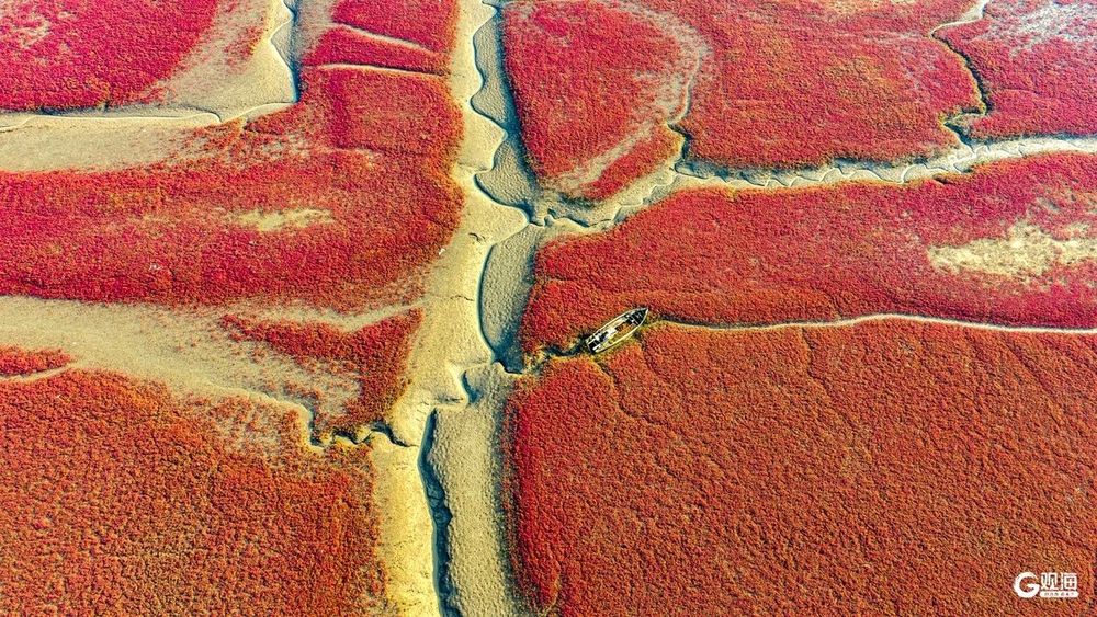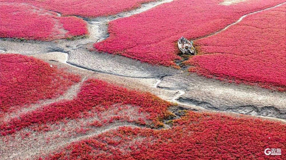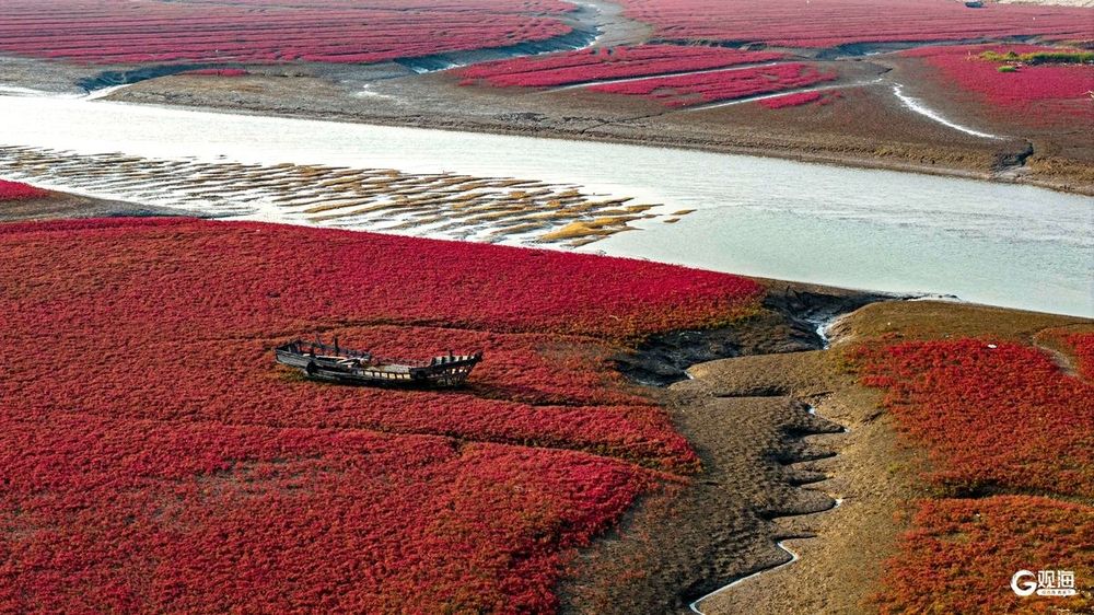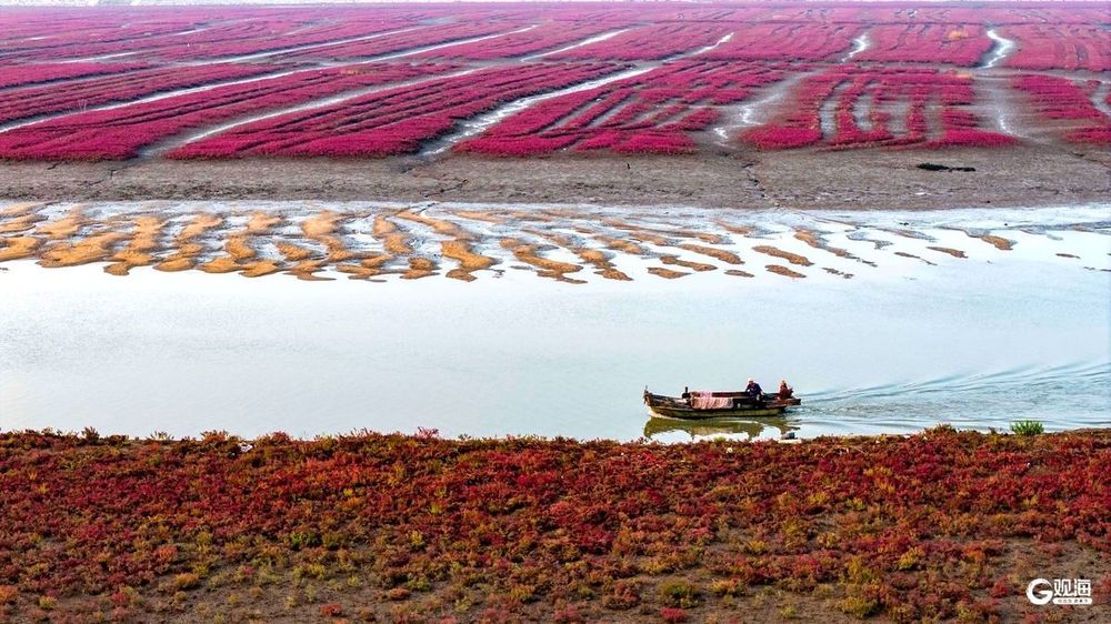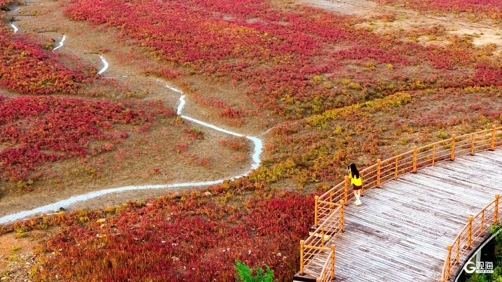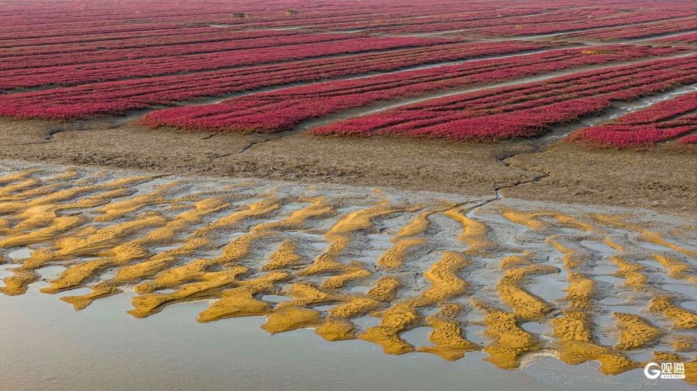 近日,青岛西海岸新区红石崖街道依偎的胶州湾湿地红海滩,迎来一年中的最佳观赏期。退潮后,绵延的碱蓬草宛如片片红毯,色彩靓丽,与深褐色的潮沟和入海的河水一起,编织出一幅幅色彩斑斓的生态画卷。