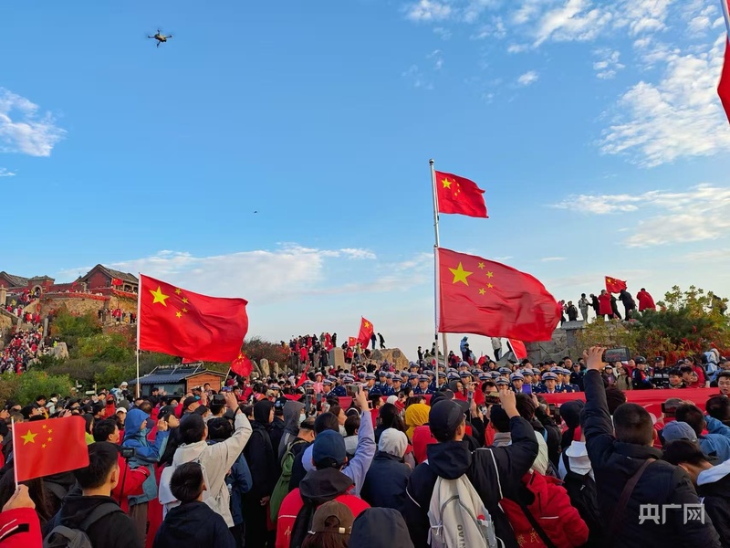央广网泰安10月1日消息(记者程立龙 唐磊 李舜)10月1日,1.3万名游客齐聚山东省泰安市的泰山之巅,以升国旗、赏日出、唱爱国歌曲的方式共同庆祝中华人民共和国成立76周年,漫山挥舞的国旗与红日、朝霞相映,让“中国红”成为国庆日泰山上最耀眼的色彩。