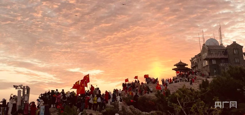 凌晨5时,秋日凌晨的泰山之巅凉意袭人,却挡不住如潮的热情。日观峰、玉皇顶等观景平台早早就聚满了来自四面八方的游客。大家手持国旗、脸上贴国旗贴纸,在微凉山风中静待日出。6时5分,一轮红日自天际升起,细碎的霞光穿透薄雾逐渐铺展成整片朝霞,金光洒满山峦。游客们自发挥舞国旗,红色旗帜在晨光中摇曳,相机快门声、欢呼声交织,定格“旭日东升映国旗”的画面。“特意带孩子来感受仪式感,让他记住祖国山河之美、节日之重。”来自江西的游客丁之璇说,孩子举着小国旗在旗杆下合照的模样,是她眼中最美的国庆风景。