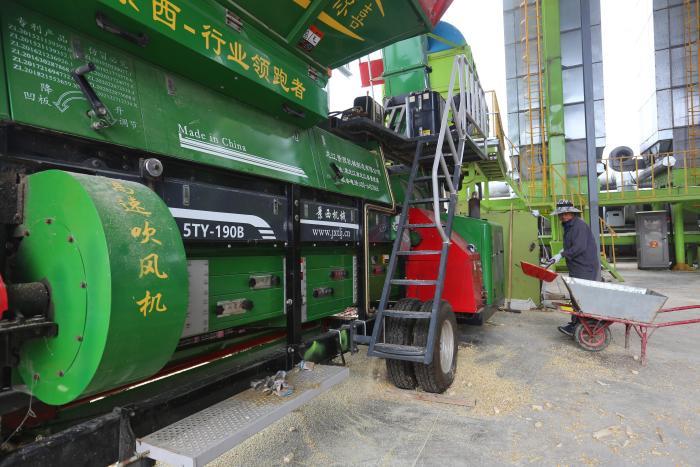 工人在山东盛源种业有限公司大型粮食烘干设备区忙碌工作。