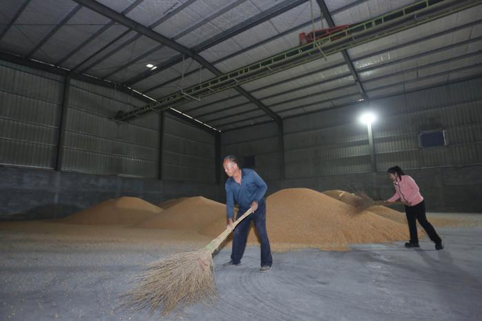 10月7日,工人在山东盛源种业有限公司秋粮存储区打扫烘干储存的玉米。