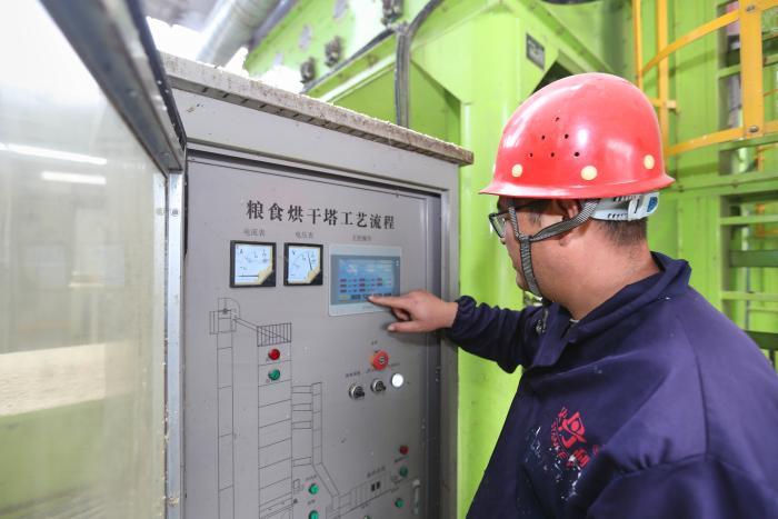 山东盛源种业有限公司技术员在调试大型粮食烘干设备数据信息。