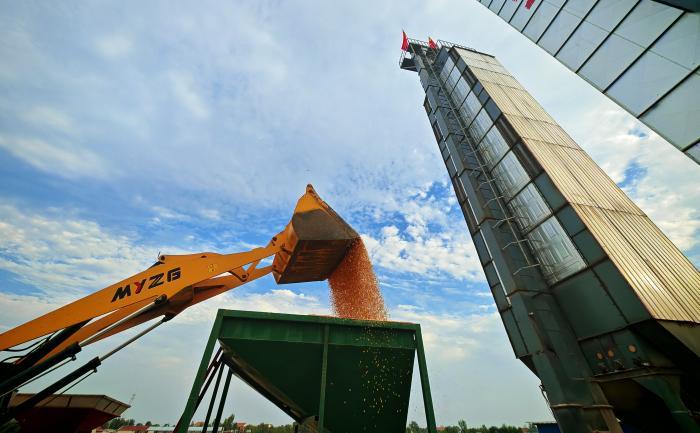 10月7日,在无棣县君华种植专业合作社内,铲车驾驶员将湿粮倒入烘干设备中。
