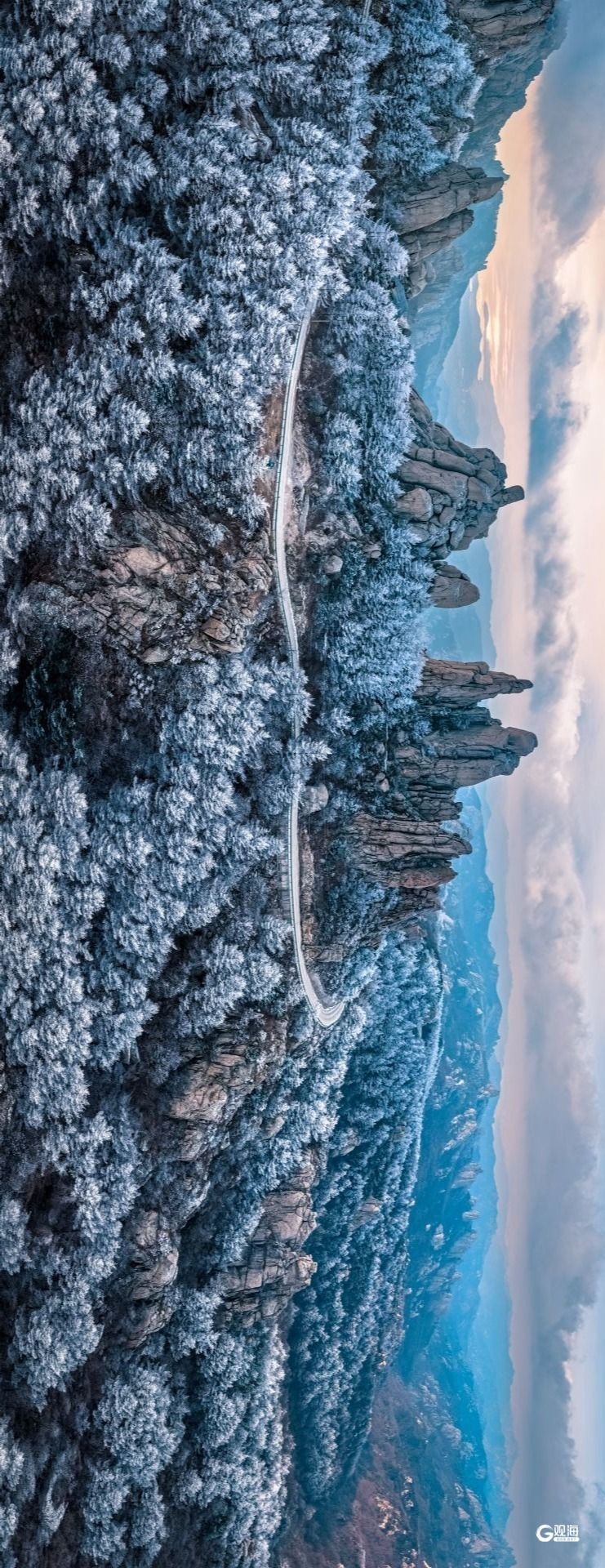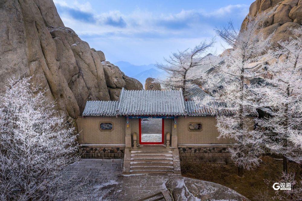 那些挂在枝梢的“雪松”,原是雾凇与雪的合谋:每根枝桠都挑着绒绒的白,像给山的骨血覆了层素纱,连风穿过的声响都轻了三分。石缝里的苔痕半掩在雪下,古建的木窗晕着暖光,山与雪、松与石,都在这冬里慢成了禅。