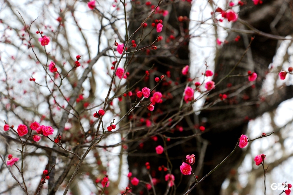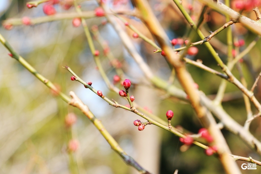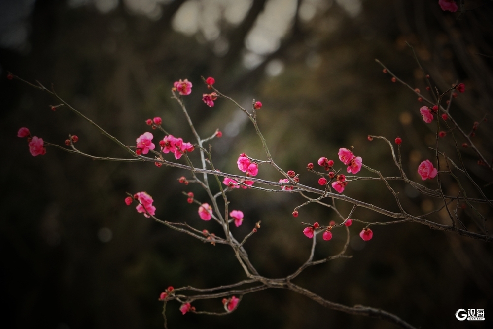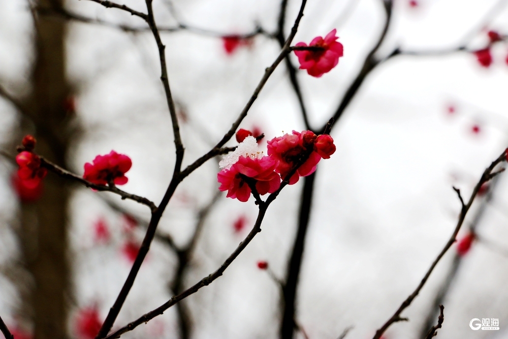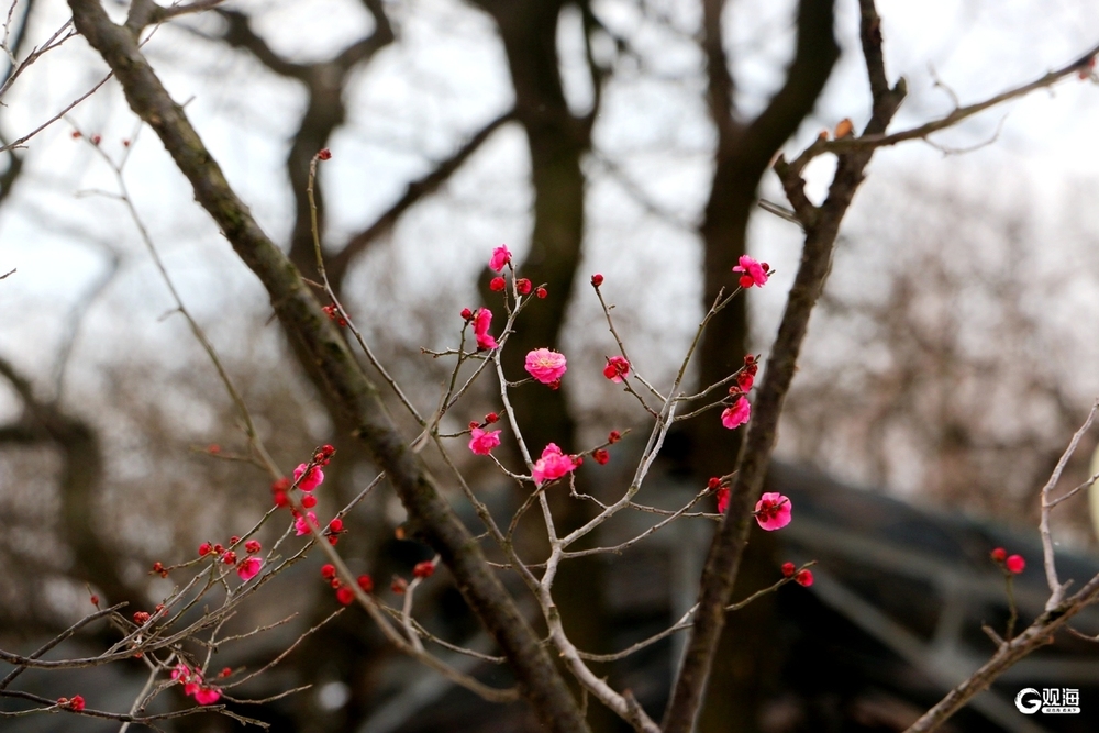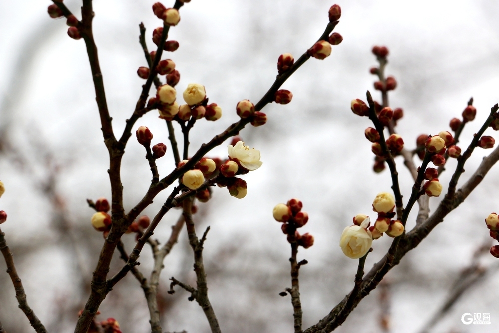 1月20日“大寒”,青岛寒意浸骨,中山公园的梅园却悄然酝酿着生机。残雪未消,枝头的梅花或半含香蕊,裹着几分娇羞;或冲破寒枝,全然绽放,艳红、粉白的花瓣在风里摇曳生姿。