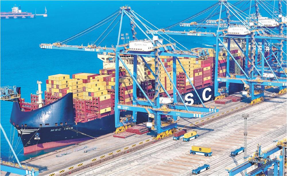 2月4日,山东港口青岛港自动化码头,大型集装箱货轮停泊,码头高效有序作业。