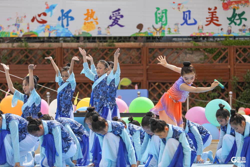 学生在青岛浮山路小学举办的“心怀热爱,阅见美好”读书节活动中展示阅读场景主题。
