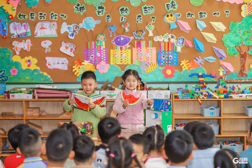 小朋友在青岛市李沧区青山路幼儿园开展的“‘青’情阅读 阅润童心”活动中分享绘本故事。