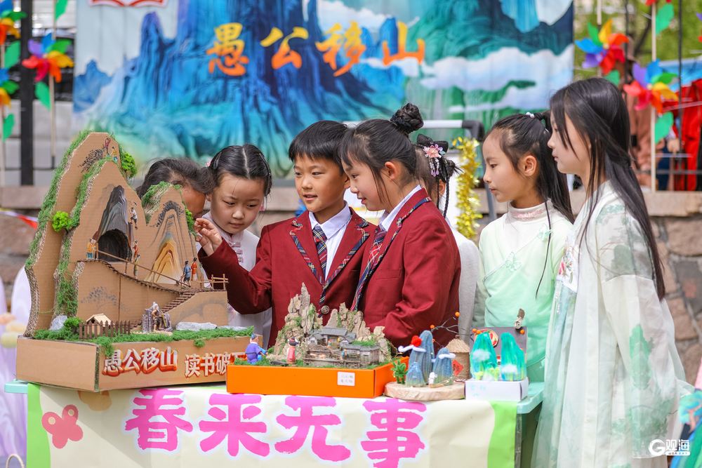 在青岛浮山路小学举办的“心怀热爱,阅见美好”读书节活动中,学生利用打造的实景介绍“愚公移山”成语故事。