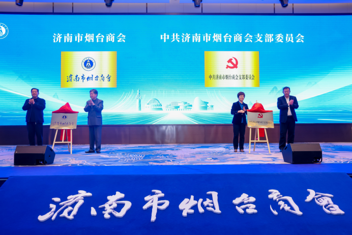 随后,大会进入揭牌环节。山东省政府原副省长谢玉堂,山东省政协副主席、党组副书记林峰海共同为“济南市烟台商会”揭牌。山东省工商联党组成员、副主席,一级巡视员孙美菊,济南市委统战部副部长、济南市工商联党组书记张勇共同为“中共济南市烟台商会支部委员会”揭牌。