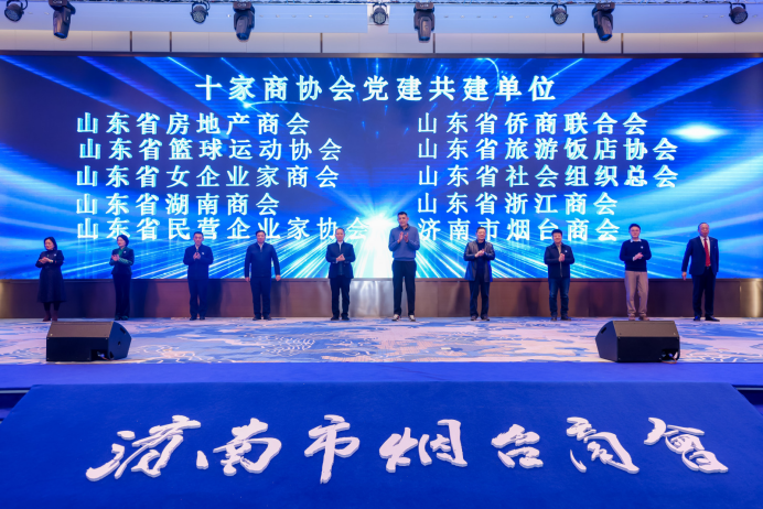 此后,现场启动了十家商协会党建共建仪式。山东省房地产商会党支部书记杨承林、山东省侨商联合会会长吴立春、山东省篮球运动协会会长巩晓彬、山东省旅游饭店协会会长何庄龙、山东省女企业家商会会长秦文、山东省社会组织总会会长王安忠、山东省湖南商会会长吴梦军、山东省浙江商会党支部书记胡小军、山东省民营企业家协会副会长窦文涛、济南市烟台商会会长王彦宏十家商协会代表共同启动共建仪式,助力跨区域、跨行业的党组织联动,构建起“党建搭台、业务协同、资源共享”的合作新机制。