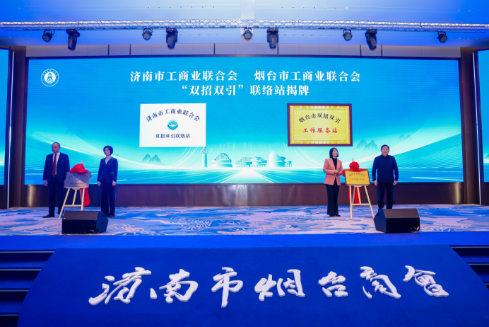 为深化济烟两地产业链、创新链、人才链的融合对接,构建常态化的协同发展机制,大会同步设立两地工商联“双招双引”联络站。济南市工商联主席刘佳与济南市烟台商会会长王彦宏共同为“济南市工商业联合会‘双招双引’联络站”揭牌。济南市人大常委会原副主任李华贤与烟台市政协副主席、烟台市工商联主席李京波共同为“烟台市工商业联合会‘双招双引’联络站”揭牌。