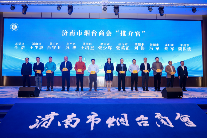 为更好地宣传烟台各县市区特色,大会现场为济南市烟台商会首批“推介官”授牌。芝罘区李浩、福山区王少波、莱山区肖守卫、牟平区苏华、蓬莱区王培杰、栖霞市张少辉、招远市张英正、莱阳市刘伟、海阳市冯军、龙口市蔡军、莱州市魏振波共11位来自烟台各县市区的代表获此聘书。济南市工商联党组成员、秘书长张攀峰与烟台市工商联党组成员、副主席于岩君共同为“推介官”授牌。