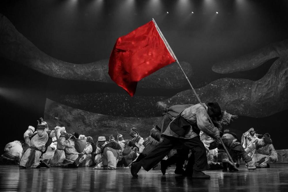 《金银滩·金银花开》融合海北藏族传统舞蹈与当代舞、古典舞元素,在音乐创作中,将草原民歌与时代旋律交织,民族乐器与现代配乐融合。舞台设计上则灵活运用活动围墙表现虚实交织场景,既呈现了辽阔的草原场景,又再现了科研基地从荒芜到崛起的建设图景。