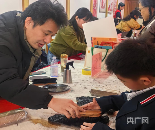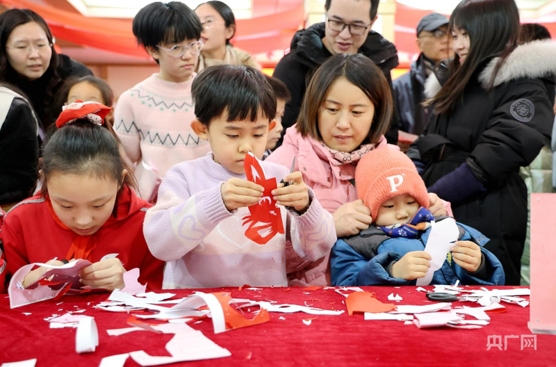孩子们在家长陪伴下,亲手体验拓福、剪纸等传统年俗技艺,在实践中感受中华传统文化的魅力(央广网发 郭友生 摄)