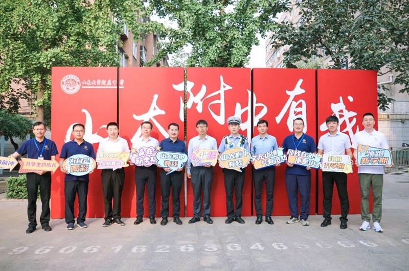9月1日早上7时,山大附中初中段执勤老师身穿正装,手持“新学期冲鸭”“超棒”“为自己喝彩”等有趣的手牌,迎接学生们回到校园,开启新学期的学习和生活。