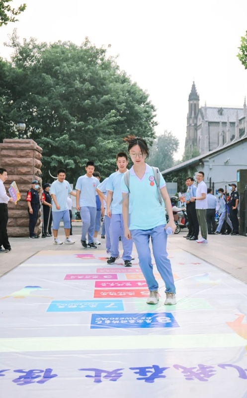 学校用心准备了创意满满的地贴,师生们像童年“跳房子”一样,欢快地走进校园。师生所跳的每一个格子都写有对新学期的期许与祝福,创意地贴也寓意着新学期学生们步步登高。