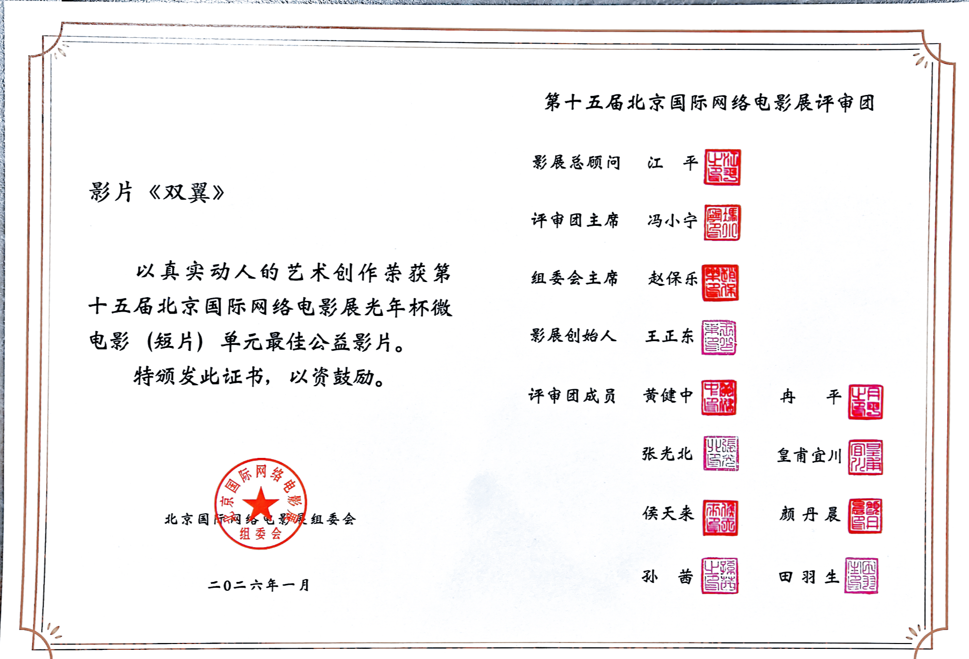 2026年1月9日,以“让每道光,都有世界回响”为主题的第十五届北京国际网络电影展荣誉盛典在北京微博IN·钻石中心举行。