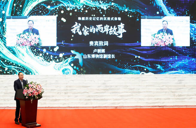 开幕式在台湾女记者与作家协会欢唱团的悠扬歌声中拉开帷幕。山东博物馆专职副书记卢朝辉对出席开幕式的领导和嘉宾表示热烈欢迎,向沈春池文教基金会对促进两岸文化交流作出的贡献表示由衷的敬意。他表示,山东博物馆作为国家级重点博物馆,近年来在省文旅厅、省台办的指导下,在台湾各界友好团体的支持下,积极发挥自身资源优势,持续深化对台文化交流,开展了一系列卓有成效的工作,有力促进了两岸同胞之间的情感联结与思想共鸣。本次“我家的两岸故事”展览,以“人”为叙事核心,串联起不同时代两岸同胞的生命轨迹。展览不仅呈现出历史的厚度,更传递出两岸人民对和平团圆的深切期盼,体现出海峡两岸的文化同源与血脉相连。山东博物馆将以本次展览的成功举办为契机,与台湾各界有识之士继续携手努力,不断挖掘和利用两地丰富的文化资源,共同传承弘扬中华优秀传统文化,为深化两岸融合发展、实现中华民族的伟大复兴贡献更多的智慧和力量。