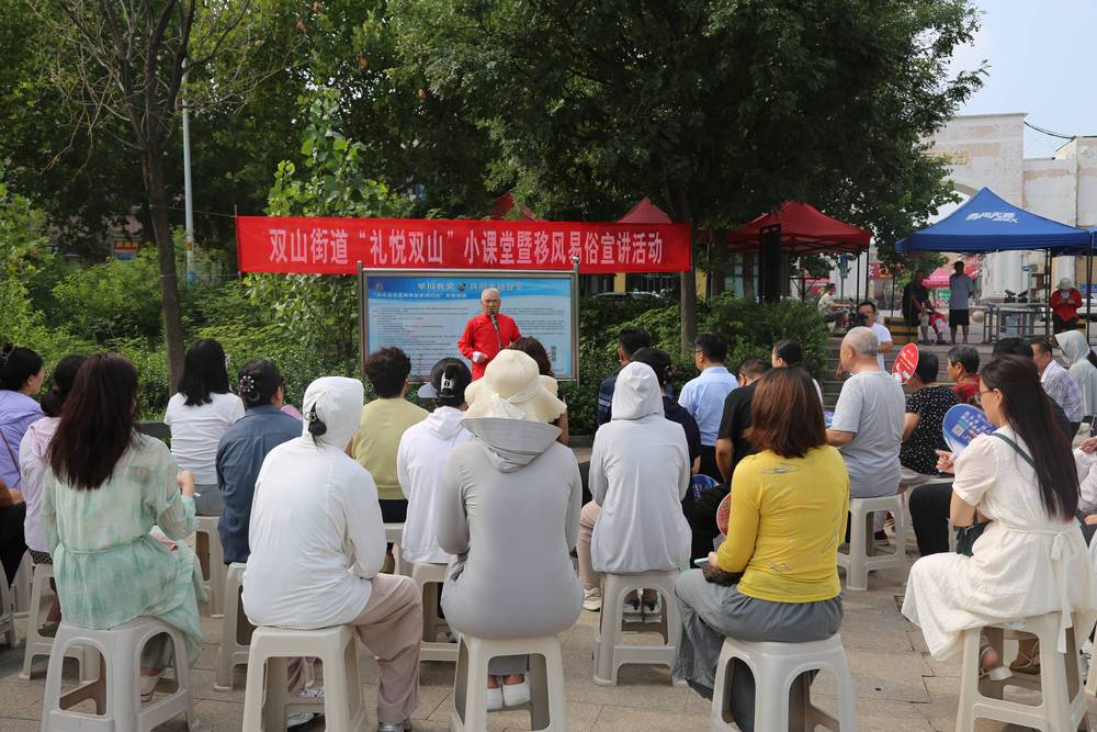 宣传形式的创新能够让文明理念以更鲜活、更亲切的方式融入居民日常生活。双山街道致力于打破传统宣传模式的壁垒,依托“礼悦双山小课堂”这一核心平台,在区新时代文明实践中心、贺套村、东山社区等地策划开展了一系列形式多样的移风易俗主题活动。活动摒弃了单向灌输,采用居民围坐聆听、互动交流的生动形式。更创新性地将专业法律讲解与歌舞朗诵、有奖问答等文艺元素融为一体,实现了“寓教于乐”。这种集知识性、趣味性于一体的方式,有效激发了居民的参与热情,在欢声笑语中引导群众破除陈规陋习、树立时代新风,使“破陋习、树新风”的文明理念在潜移默化中深入人心。