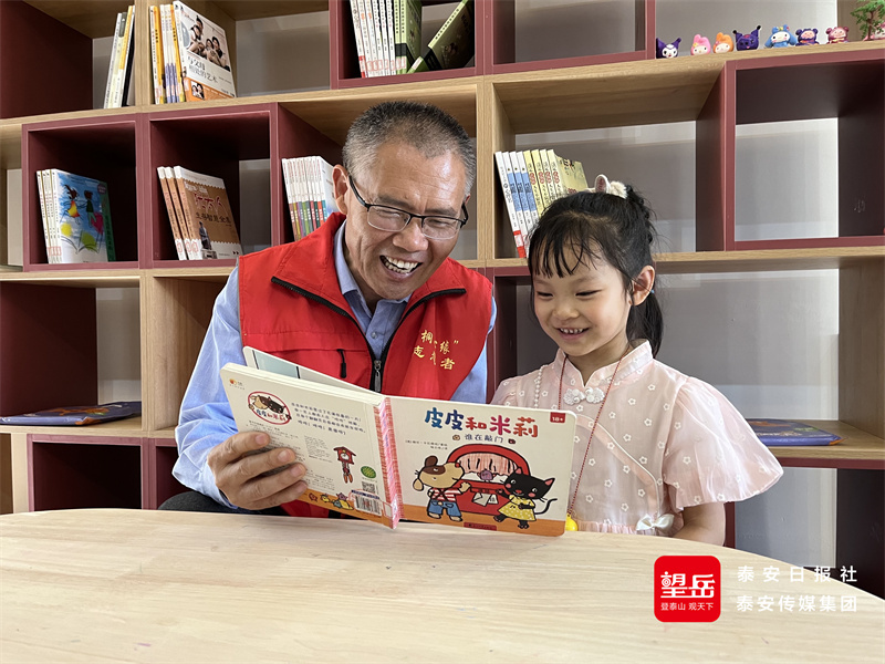 宁阳县文庙街道梧桐里社区“暖心爷爷”志愿者给孩子讲故事。