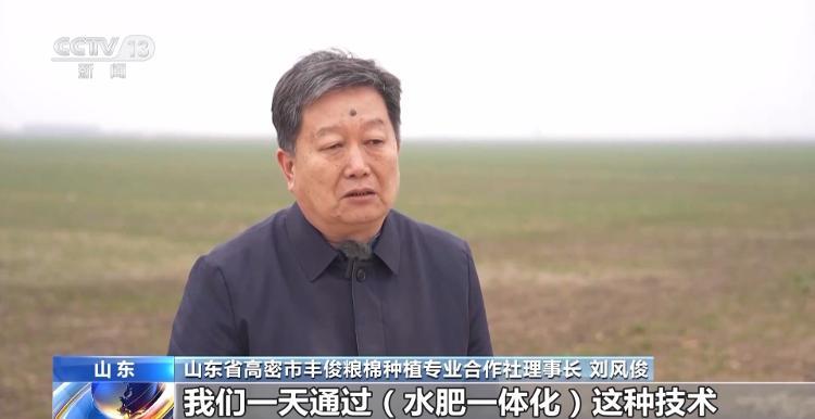 山东省高密市丰俊粮棉种植专业合作社理事长刘风俊:我们一天通过水肥一体化技术,一个人工能浇200亩地左右,但是我们以前通过人工漫灌,也就浇5亩到6亩地。