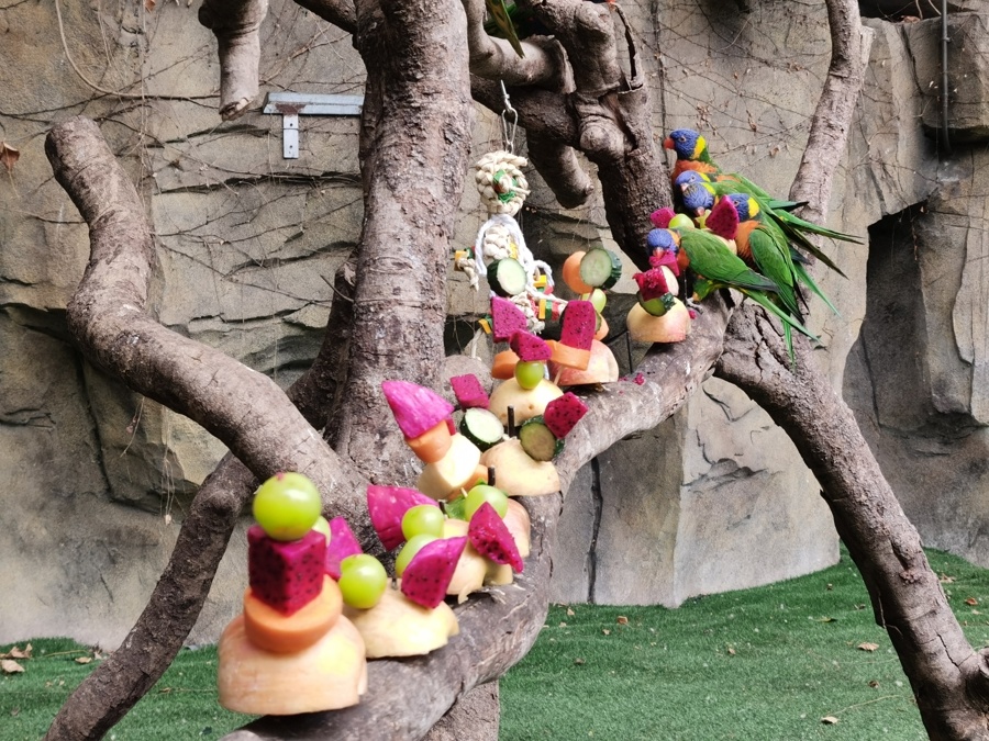 上百只来自大洋洲的吸蜜鹦鹉在高处的栖架上叽叽喳喳地“开会”,因为它们发现保育员贾梦薇最近把一些造型新颖的串串插到了它们的公用餐桌——三根枯木搭建的“H”型栖架上。