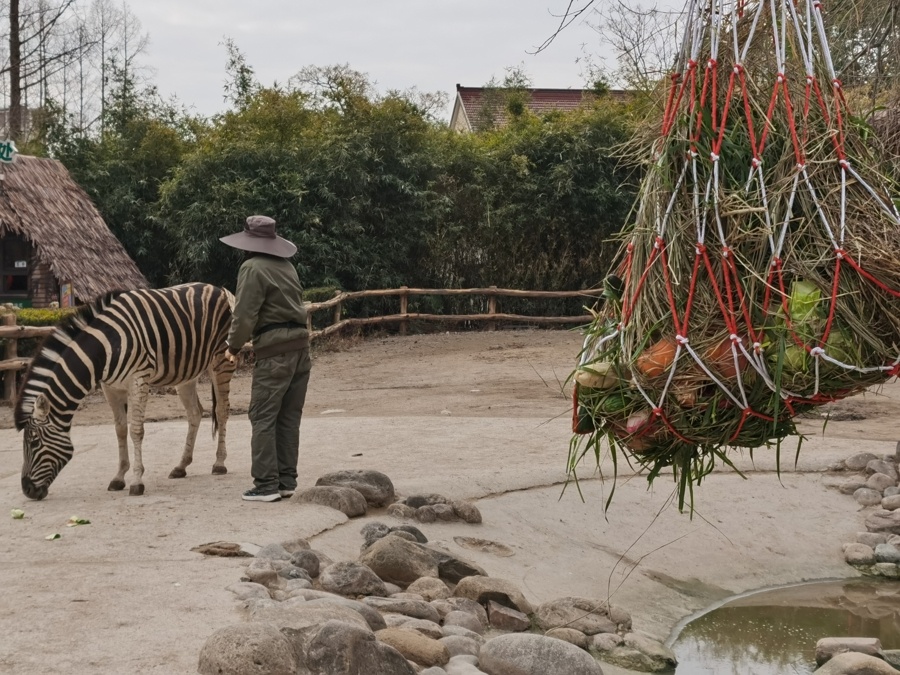 “这个叫马年福袋,是斑马们春节才能吃到的年菜,也是一种丰容方式。”陈永健解释说,丰容是动物园学术语,是在圈养条件下通过食物、环境等刺激措施,促进野生动物展示自然行为、改善生理心理状态。这个福袋由外到内分别是网兜、干草、馅料。