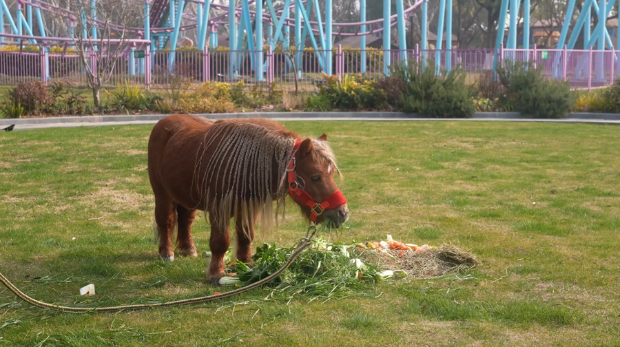 在上海野生动物园,设特兰矮马“飘飘”趁着迎宾高峰期的间歇,享用起了豪华的年菜兼“工作餐”。除了平日常见的“大米饭”——青草、干草,额外增加了苹果、胡萝卜、黄瓜、橙子、番茄等蔬果。