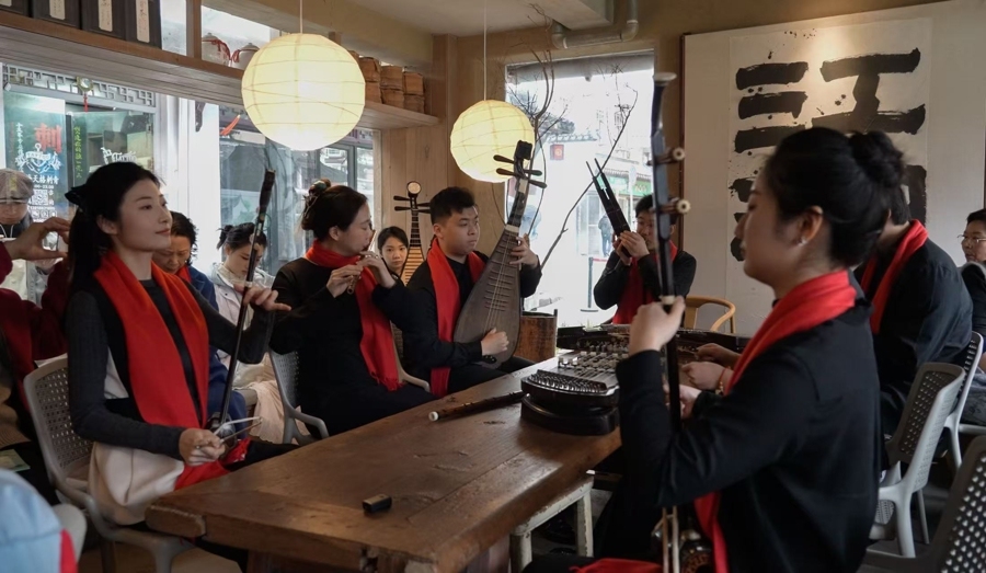 “江南丝竹本是老百姓生活的一部分,我们要把这份属于民间的音乐放回到它原来的环境。”上海音乐学院音乐学系萧梅教授谈及活动背景时直言项目的初心。据悉,江南丝竹素以“小、细、轻、雅”著称,丝弦乐器温润、幽微的音色曾是这一审美气质的重要底色。但随着20世纪中期钢丝弦逐渐普及,以蚕丝为弦的旧时音声在城市日常中日益稀少。对不少年轻演奏者而言,“丝弦”更多停留在书写与想象之中。因此,让学生回到茶馆这样真实的合奏环境里学习十分重要。“民间老师傅能教给学生传统合乐‘搿丝竹’的细节与玩法,比如字眼处的加花即兴、乐器声部的进退、节奏的松紧以及彼此的呼应,这些经验往往难以完全写进谱面,却直接关系到江南丝竹的‘味道’与生命力。”萧梅告诉记者。