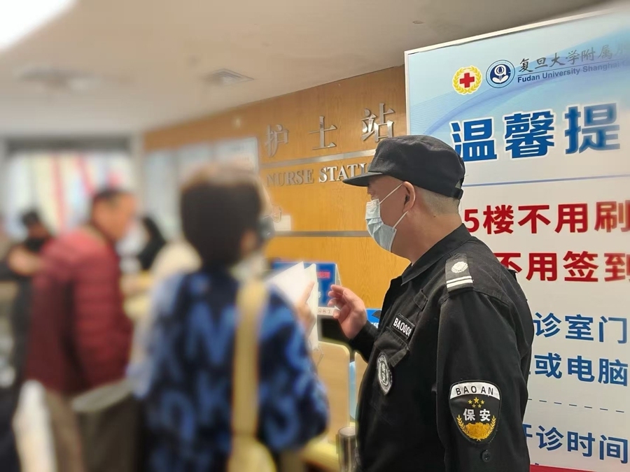 尽管这样的意外并不多见,但对肿瘤患者来说,脆弱的身心格外需要呵护,查选举就是医院里那多一道的“保护墙”。不少前来就诊的患者对他印象深刻,“这名保安蛮好的,最主要是态度好,耐心!”患者刘阿姨每次来复诊,都记得他,“一直笔笔挺站在门口,有啥不懂问他就行。”而对医生来说,合理的就诊秩序维护了良好工作环境。说时,嵇庆海教授助理与查选举沟通一名回访患者,“他先去做检查,一会完成了,可以先进来问问。”