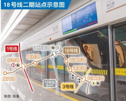12月27日,上海轨交18号线二期工程开通初期运营。新启用的5座地下车站中,呼兰路站可与1号线进行换乘,连接18号线一期二期的长江南路站可换乘3号线。