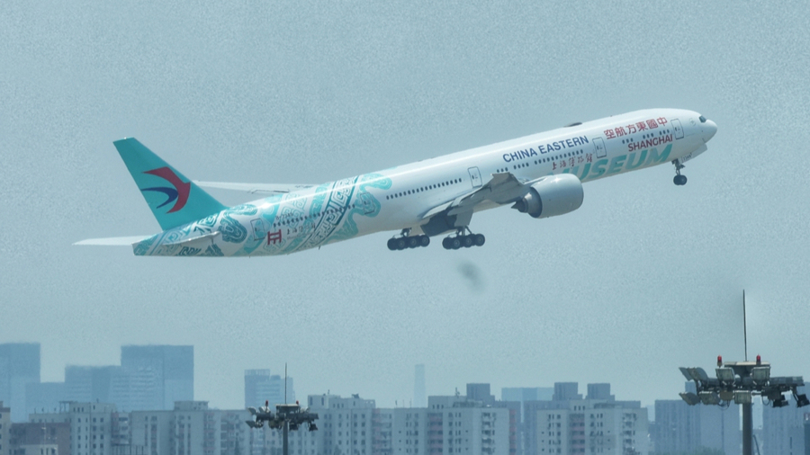 以中国古代艺术为主题的宽体彩绘飞机——“上博号”正式启航。记者 赖鑫琳 摄