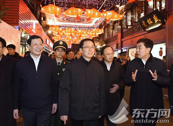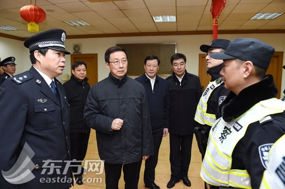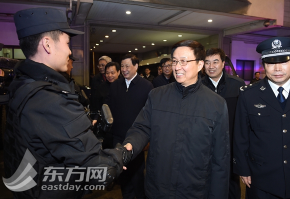 图片说明:大年初二晚上,市委书记韩正,市委副书记、市长应勇检查城市安全保障工作,亲切看望慰问一线公安干警、消防战士和平安志愿者。(陈正宝摄)