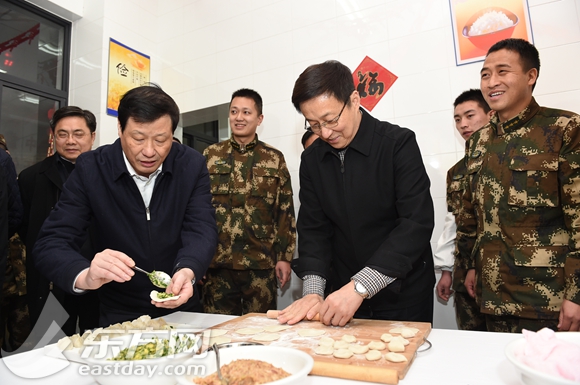 图片说明:韩正、应勇等市领导与战士们一起擀饺子皮、包起饺子,围坐一起吃饺子,热腾腾的厨房里十分温暖。(陈正宝摄)