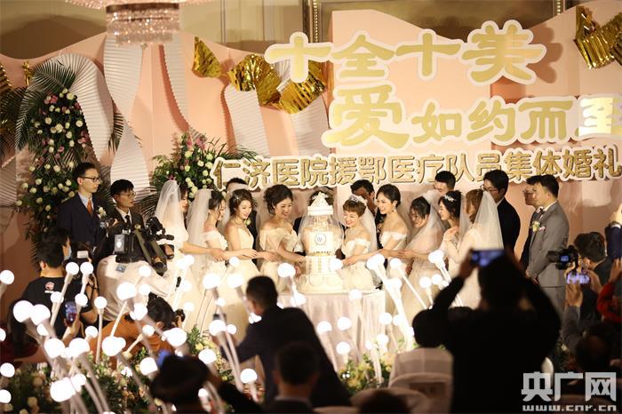 上海交通大学医学院附属仁济医院今天(1日)在上海为十对新人举办了一场特殊的集体婚礼。其中,十位新娘和一位新郎是上海市第八批、仁济医院第三批援鄂医疗队队员。上海交通大学党委书记杨振斌,上海交通大学医学院党委书记范先群,上海交通大学医学院附属仁济医院党委书记夏强等领导出席。杨振斌担任证婚人,夏强致辞,婚礼仪式由黄浩主持。十对新人在至亲好友的见证下,在同事、朋友、“战友”们的云祝福中,宣告爱的誓言,喜结爱的契约。