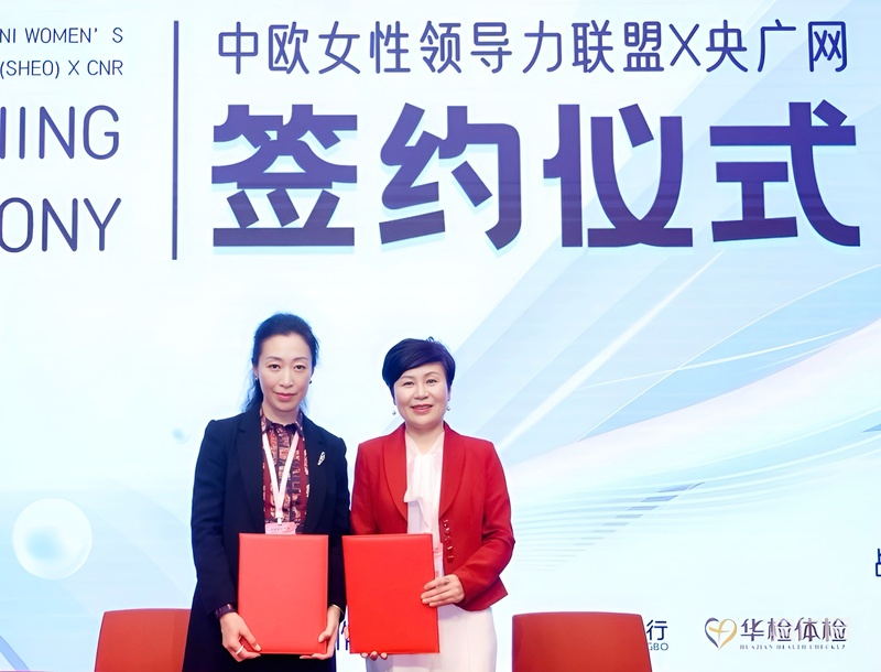 央广网上海分公司总经理顾梅(左)、中欧校友女性领导力联盟会长吕翠峰登台签约。 (央广网发 活动方供图)