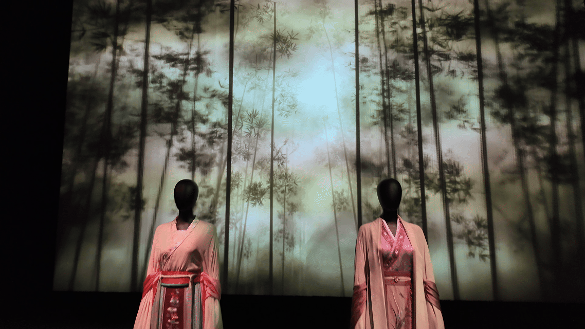 马莉莉:这一次就先说说灯光师王天宏老师的出场。记得那是布展的一天深夜,我陪同叶锦添老师走进繁忙的布展现场,进行展厅灯光调整和验收。有一束紫色浪漫的光打在第二个展厅黄色稻草壳和黄泥灰涂抹的夯土墙上。我清楚地记得,叶老师非常灿烂地一笑,一扫一天工作的疲惫。他对我说,“你看,天宏在用这一束光等我,这是我们之间的暗号和默契。”的确,灯光有了,展厅里的背景和展品立刻活起来了,更加生动和具有表现力、冲击力和舞台效果。特别令我印象深刻的,是叶老师为《封神》这部电影创作的一张电影画面《昆仑仙境》。有了光,仿佛真的仙气缭绕,让面前展柜里御龙帛画中的人物和龙凤呼之欲出。遗憾的是,我和天宏老师当时在展厅里擦肩而过,后来我才知道,站在高梯上满身灰尘的那位瘦瘦的先生,竟然就是拿奖拿到手软的王天宏老师。