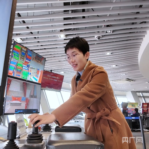 央广网记者冯丽在智慧指挥中心模拟操控轨道吊(央广网记者 何智康 摄)