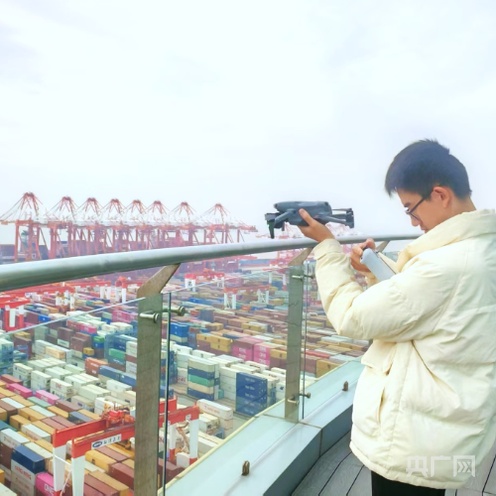 央广网记者何智康从高处观察洋山四期风貌(央广网记者 冯丽 摄)