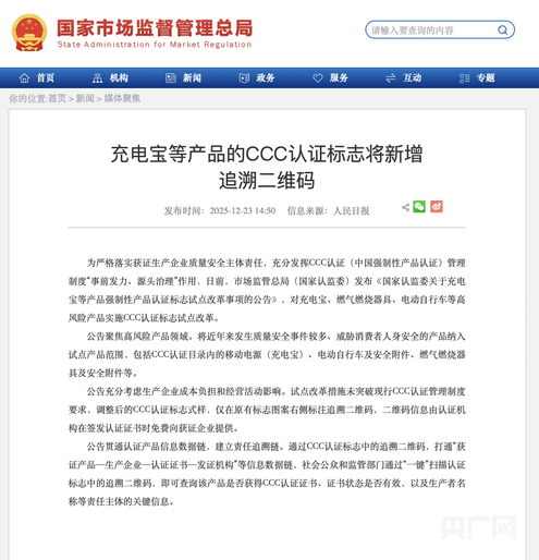 据了解,2025年年底,国家市场监管总局(国家认监委)发布相关公告,对充电宝、燃气燃烧器具、电动自行车等共计3类11种高风险产品实施CCC认证标志试点改革。CCC认证标志试点改革涉及的产品将调整CCC认证标志式样,在原有标志图案右侧标注追溯二维码,二维码信息由认证机构在签发认证证书时免费向获证企业提供。