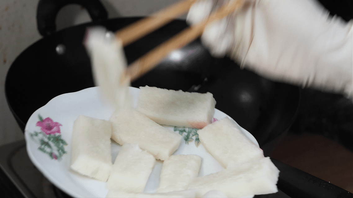 将桶蒸糕切片油炸是许多居民记忆中的童年“美食”(央广网记者 何智康 摄)