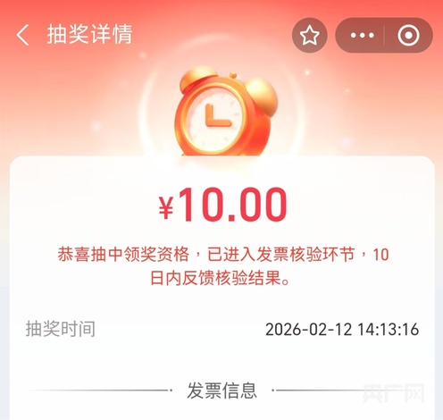 市民林小姐在店员帮助下,开出了一张105元的电子发票,上传到支付宝抽奖平台后,页面跳动显示抽中了10元。“感觉像小时候的‘刮刮乐’,10元虽然不多,但也是生活中的一份小惊喜。听说到7月份之前开发票都能抽奖,接下来,我吃饭或购物都会记得开发票,希望能有好运气。”