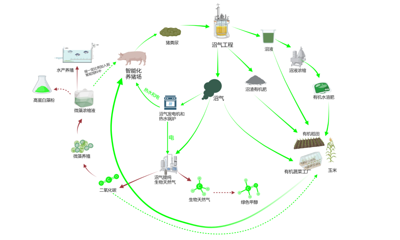 “发酵产生的沼液、沼渣也实现了全量利用。”付娟林介绍,沼液年还田近8万吨,经浓缩制成有机水溶肥;沼渣加工为有机基肥,两类肥料同步输送至有机稻田、有机蔬菜工厂,滋养玉米、蔬菜等作物,每年可节约农田化肥施用成本约200万元。沼气提炼甲烷气的过程中产生的二氧化碳,又被回送至微藻养殖环节,与水产养殖产生的微藻浓缩液、高蛋白藻粉一同按比例加入常规饲料中回流到养猪场,形成养殖—废弃物—能源—种植—养殖的完整闭环,生物天然气还可进一步转化为绿色甲醇,拓展绿色能源应用场景。