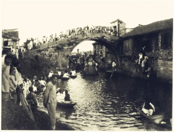 1913年6月,嘉定县城龙舟竞渡,龙舟过聚善桥景象