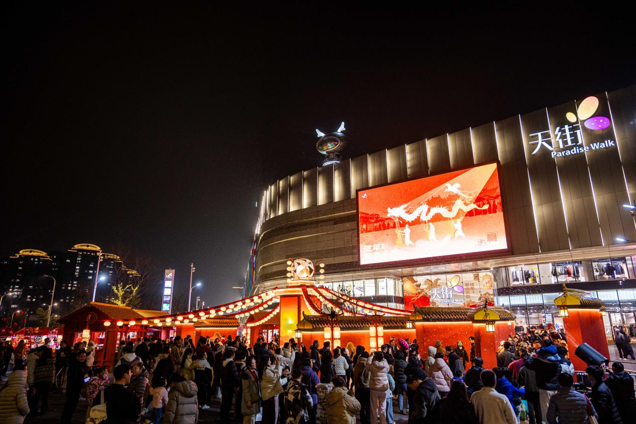在爱企谷,320米长的火马灯阵如星河倾泻,百家姓灯与光影秀交相辉映,市民穿梭其间,仿佛步入一场穿越时空的梦境。而龙湖奉贤天街的“万福灯海”下,周末限定的“雪打红灯”飘雪场景更引得众人驻足,浪漫诗意中尽显都市年味。